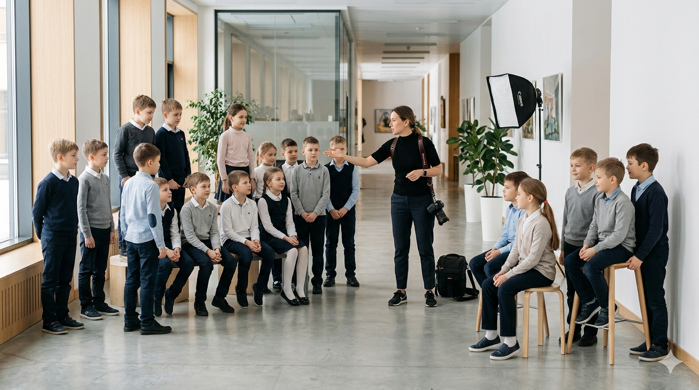 Съемка большого класса — это всегда проверка фотографа на стрессоустойчивость и режиссерские навыки. Когда перед вами 30 и более энергичных учеников, стандартная схема «высокие назад, маленькие вперед» часто превращается в визуальную кашу.