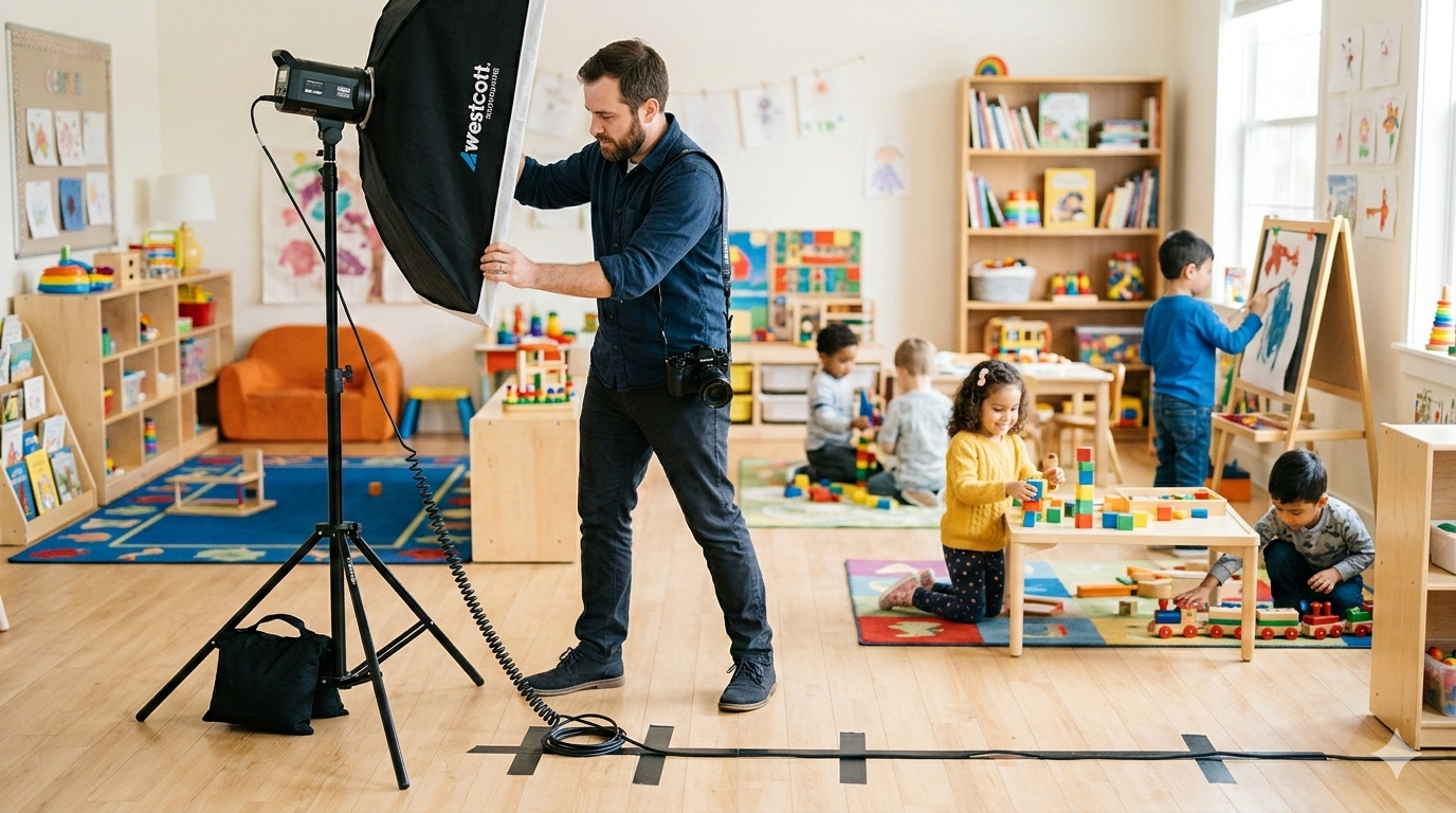 - Никаких проводов на полу: Дети бегают и не смотрят под ноги. Если используете импульсный свет, работайте от аккумуляторов. Если провода неизбежны — намертво приклейте их к полу тейпом.