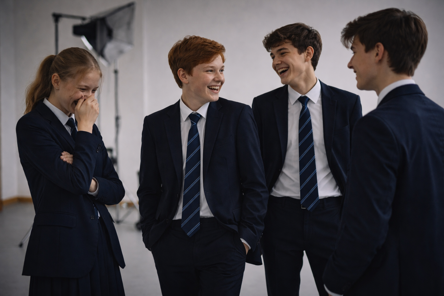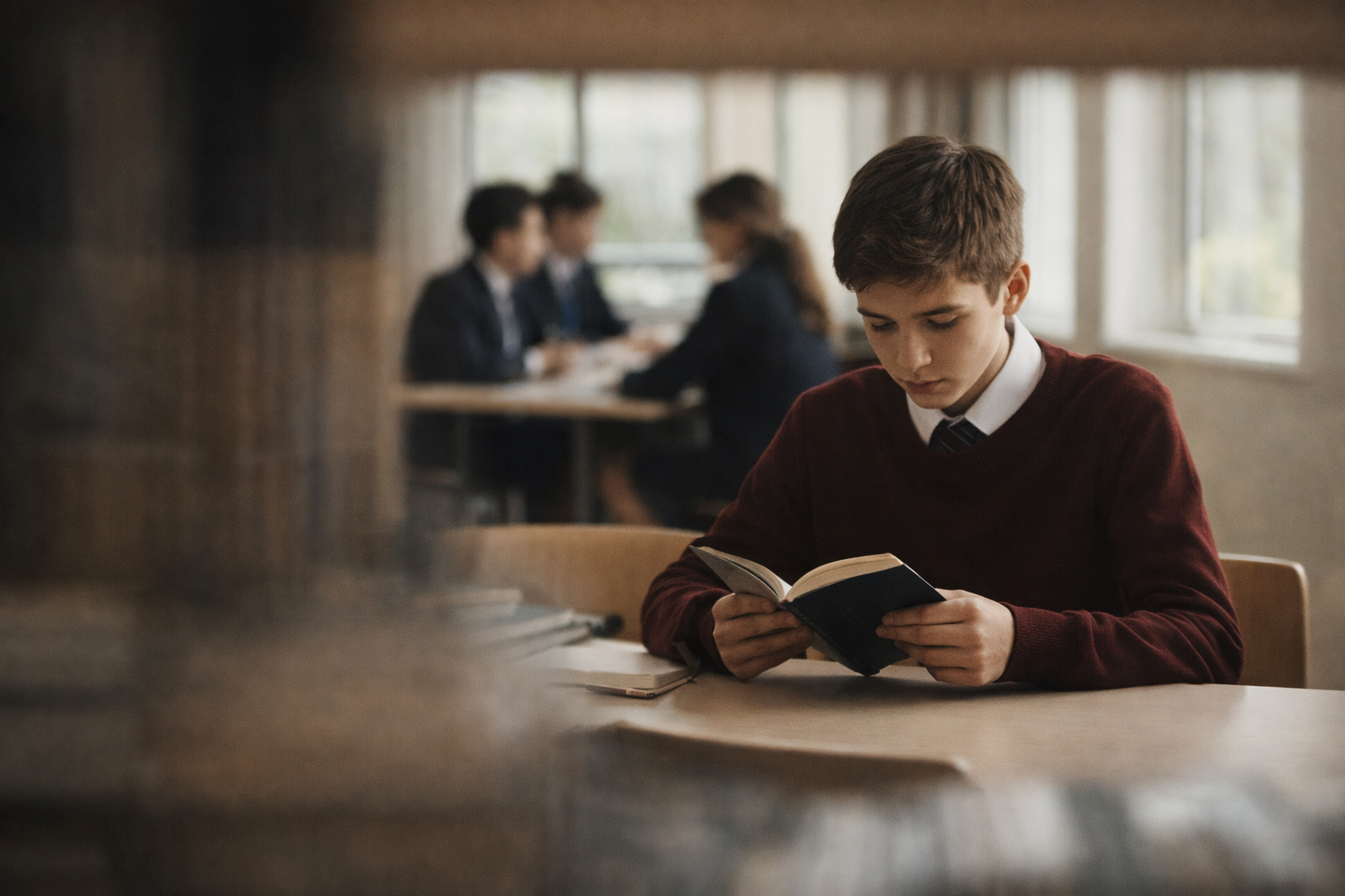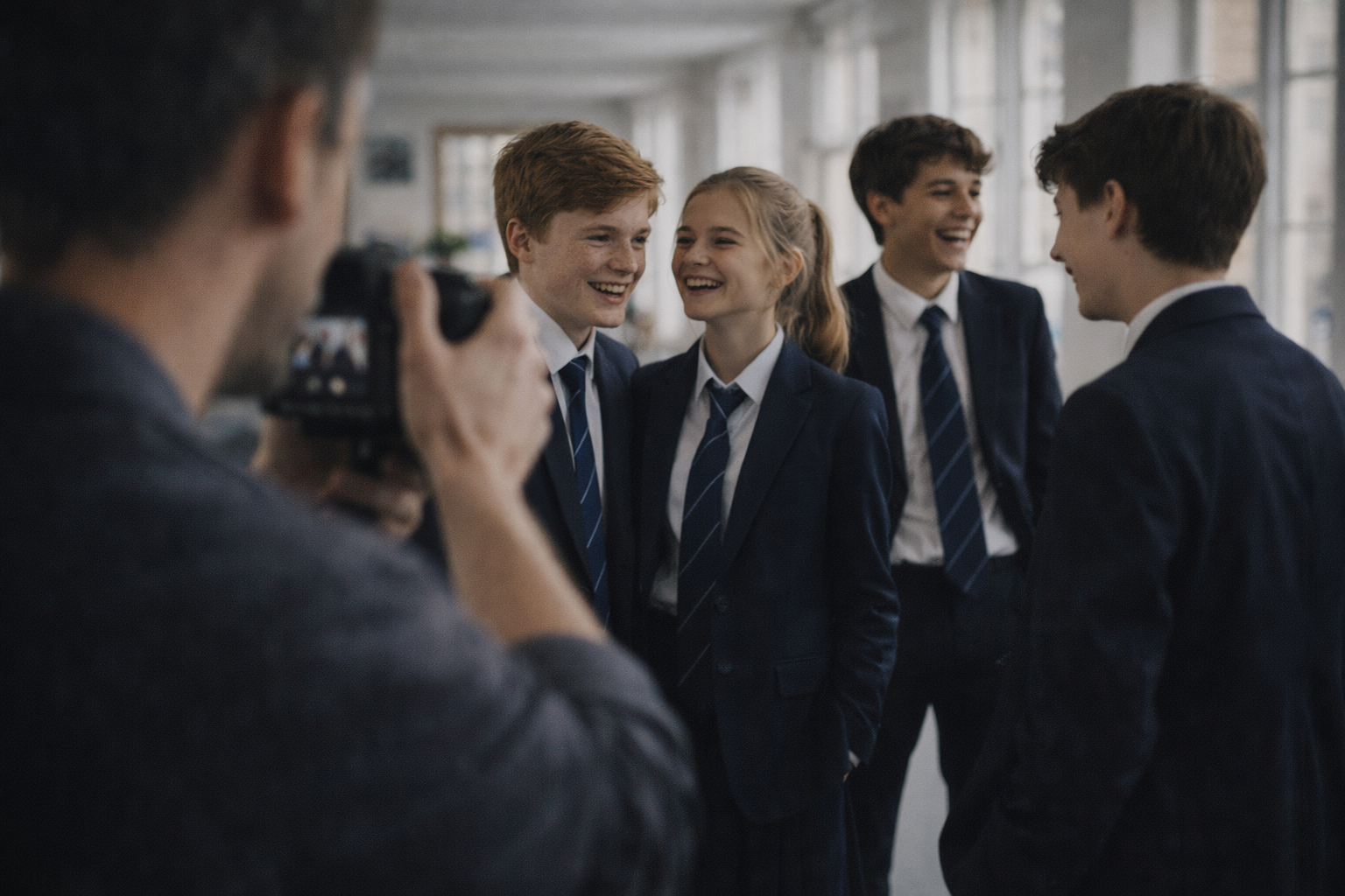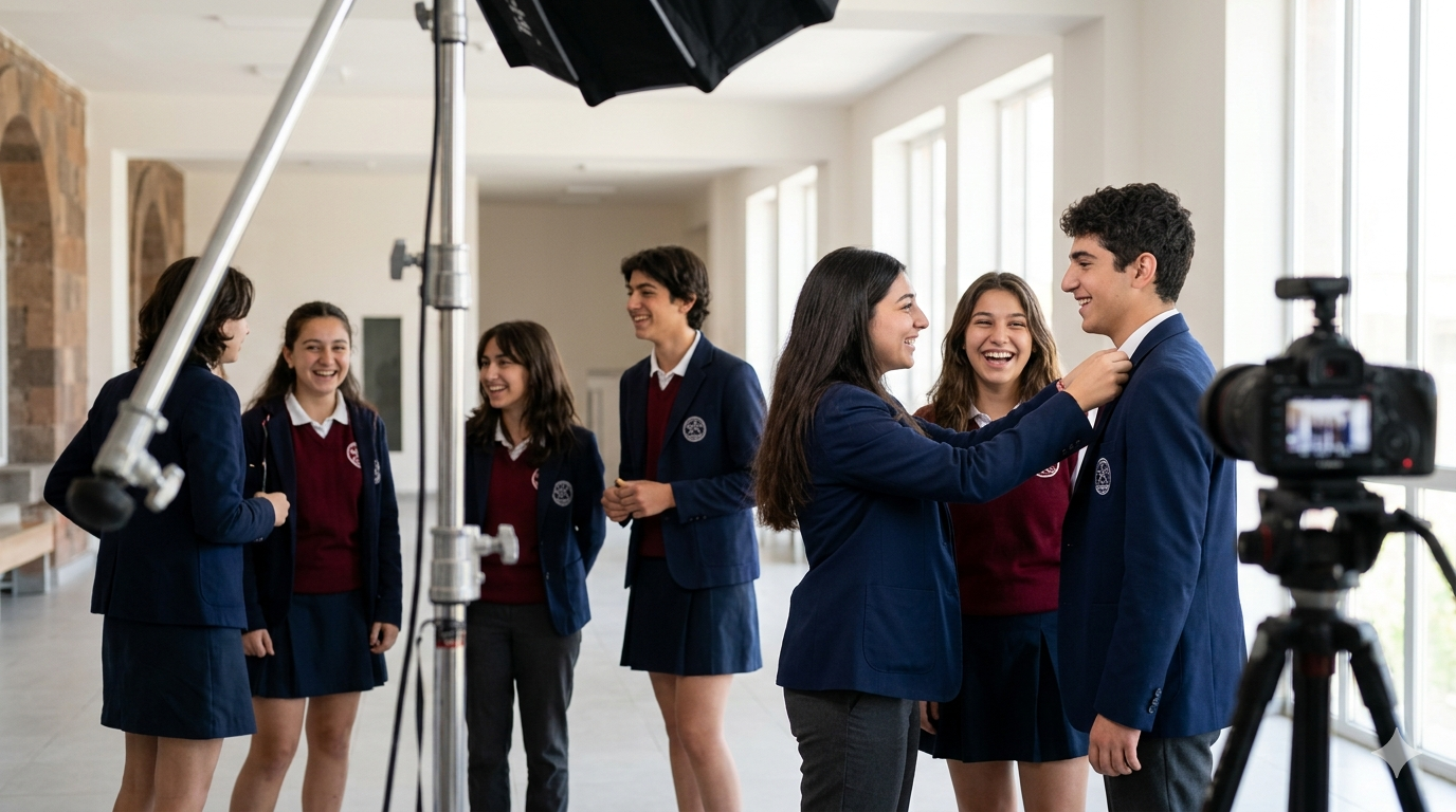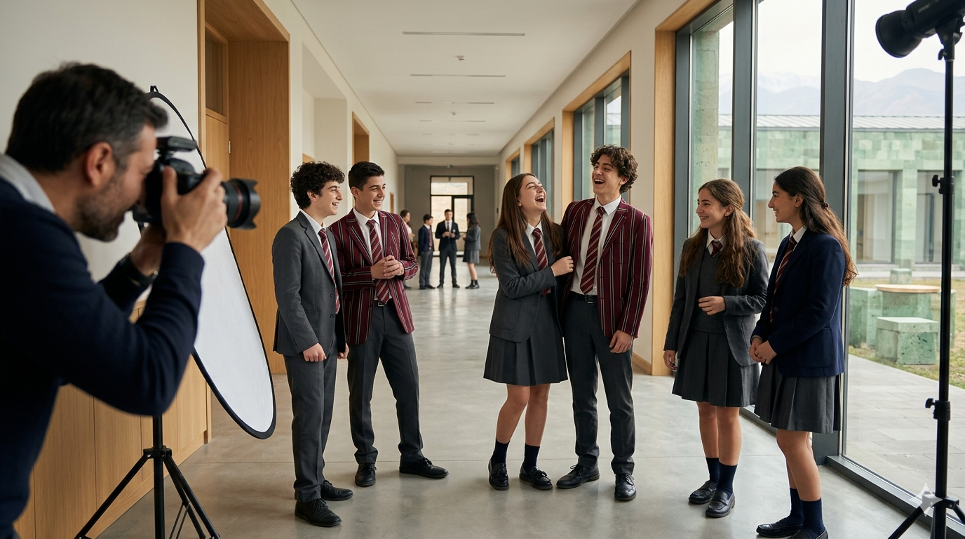 - Многослойность: Снимайте через плечо другого ученика, через приоткрытую дверь или стекло. Это создает эффект присутствия, будто зритель подглядывает за настоящей школьной жизнью, а не смотрит на выставку манекенов.