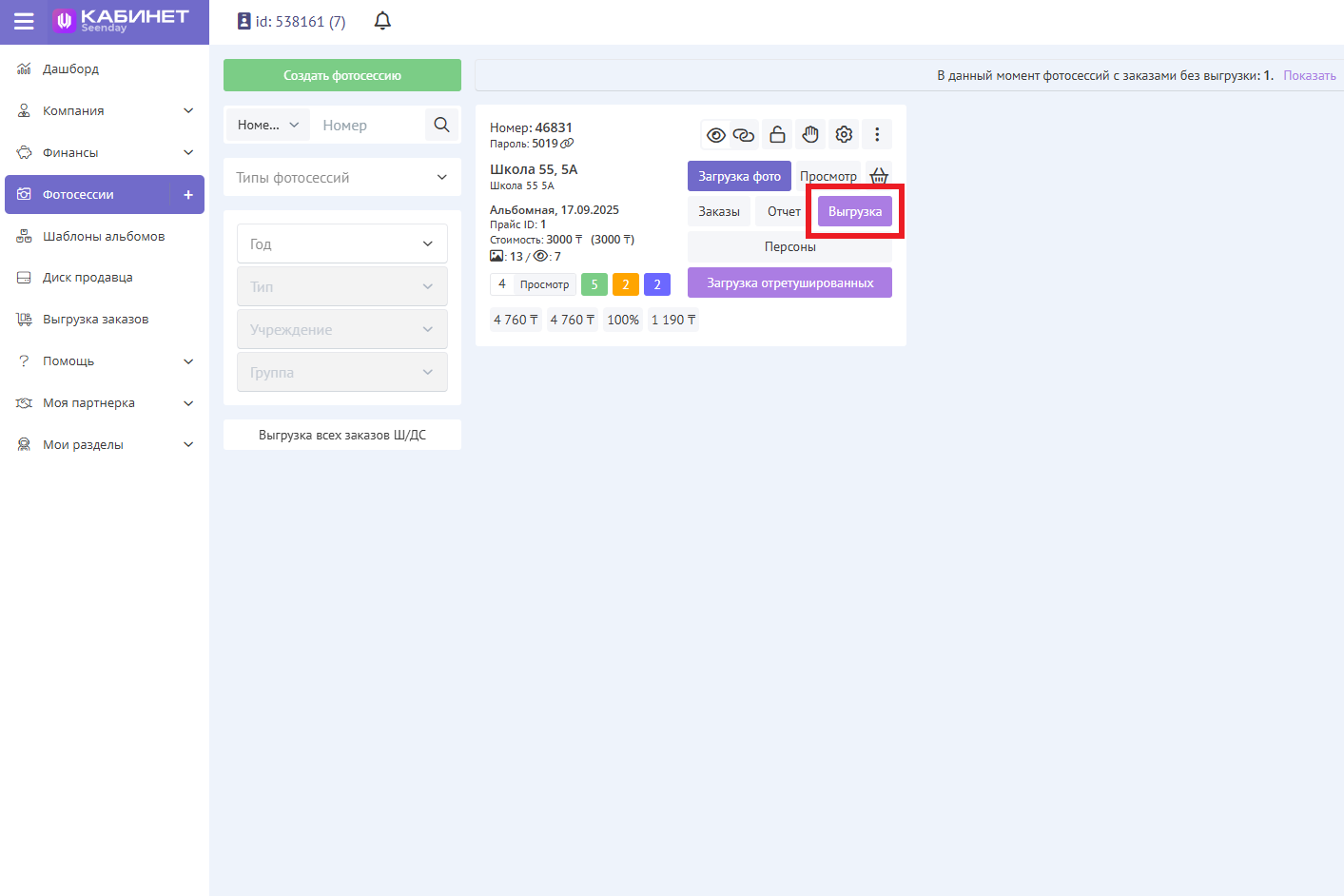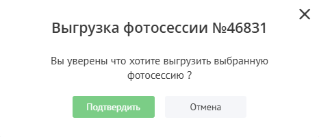 Перейдите в раздел "Фотосессии". Найдите нужную фотосессию и нажмите "Выгрузка". Подтвердите действие.