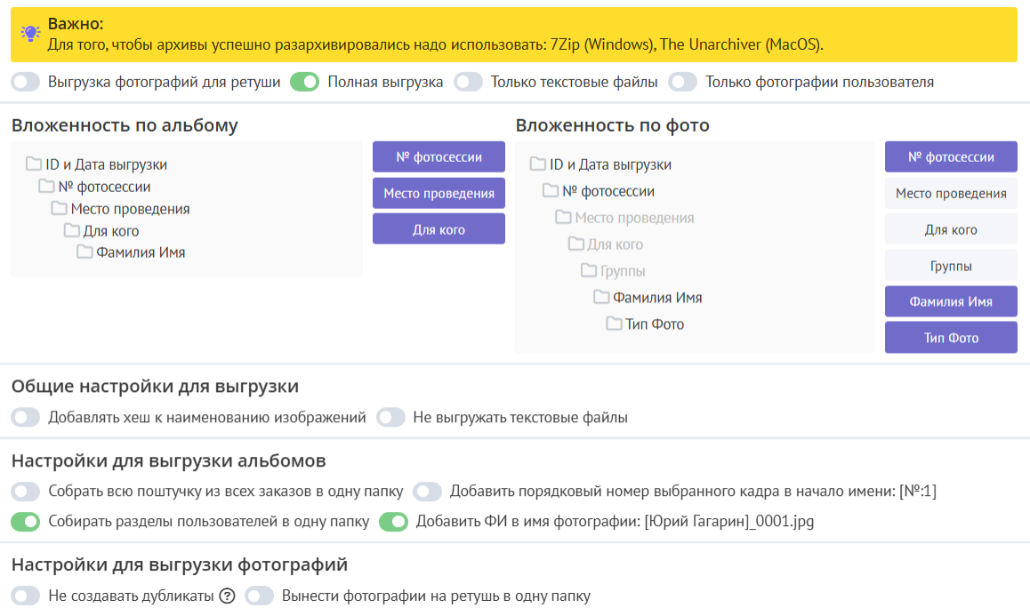 · Выгрузка фотографий для ретуши – выгрузятся все файлы без разделения