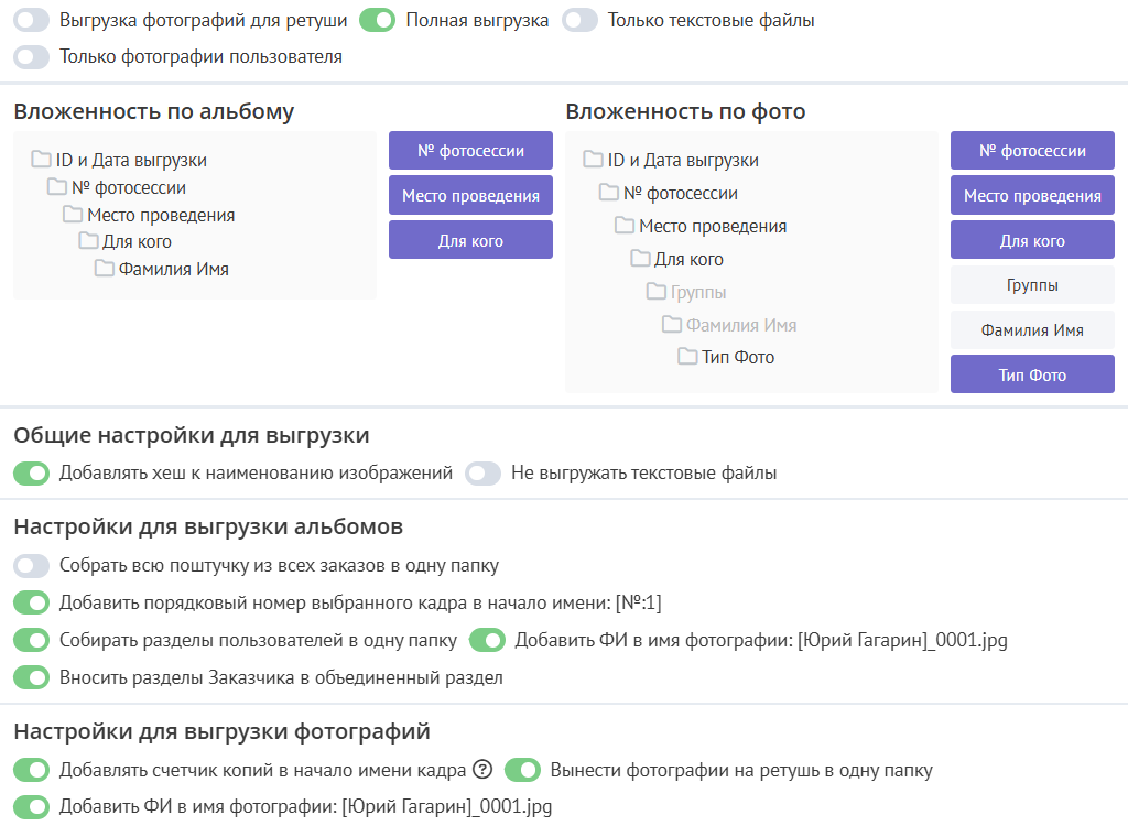 · Добавить ФИ в имя фотографии – настройка, относящаяся к предыдущей. При общей выгрузке по разделам, к каждой фотографии будет приписано ФИ пользователя.