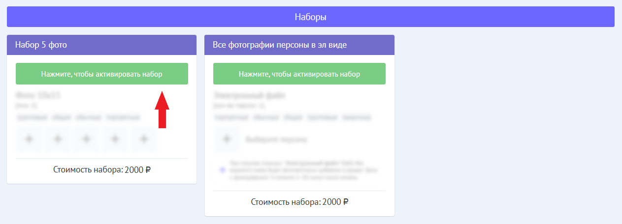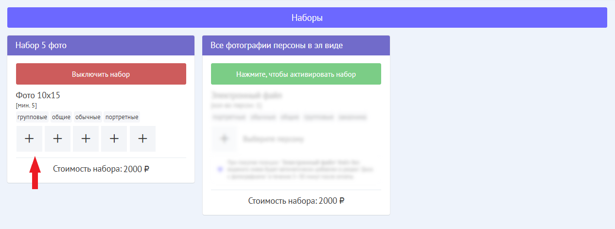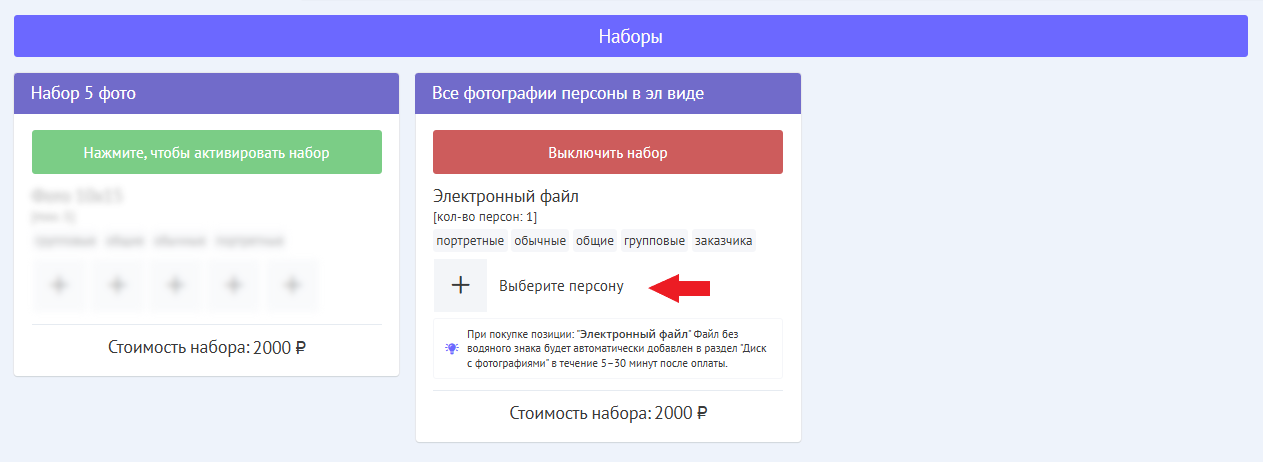 А чтобы купить набор "Персона" (все фотографии ребенка в эл. виде), также активируйте набор, и выберите своего ребенка, чтобы все его электронные фотографии добавились в заказ: