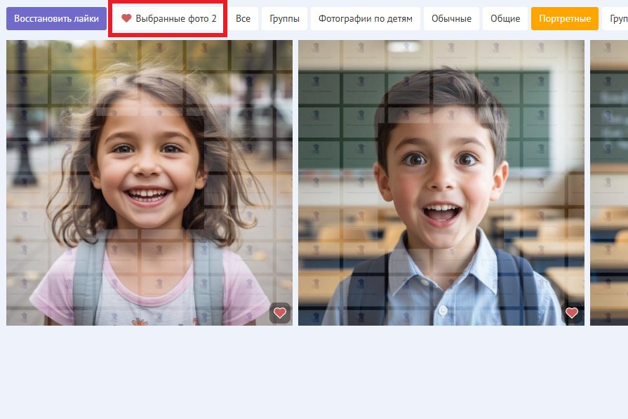 А так выглядит разделение по детям. Нажмите на папку с изображением своего ребенка, чтобы отобрать его фотографии в заказ: