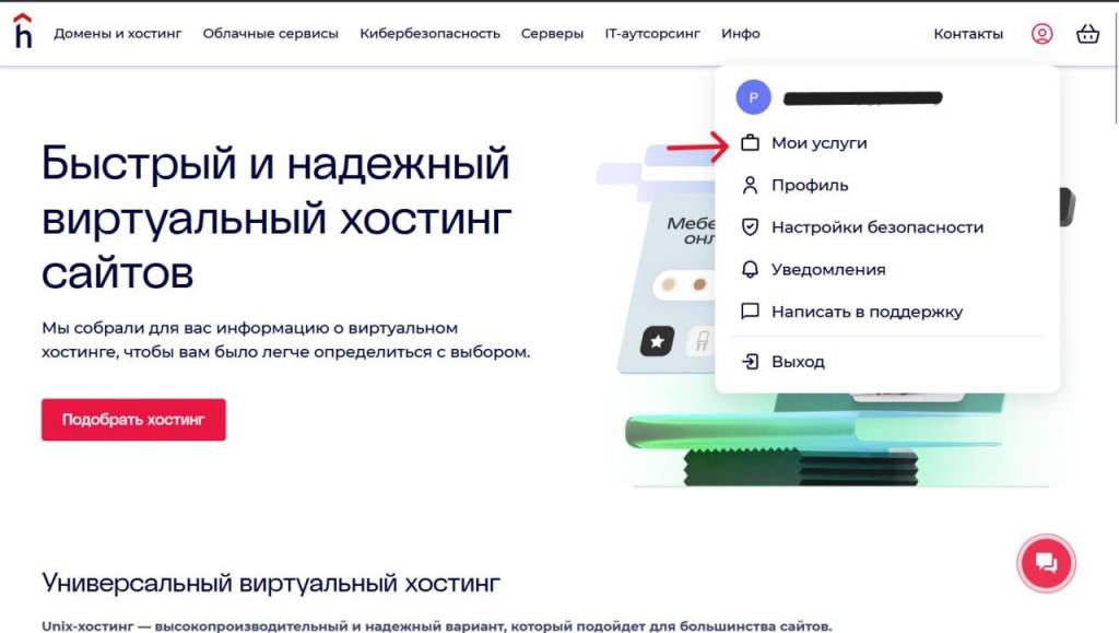 4. В левой шторке меню выберите «Услуги» → «Хостинг».
