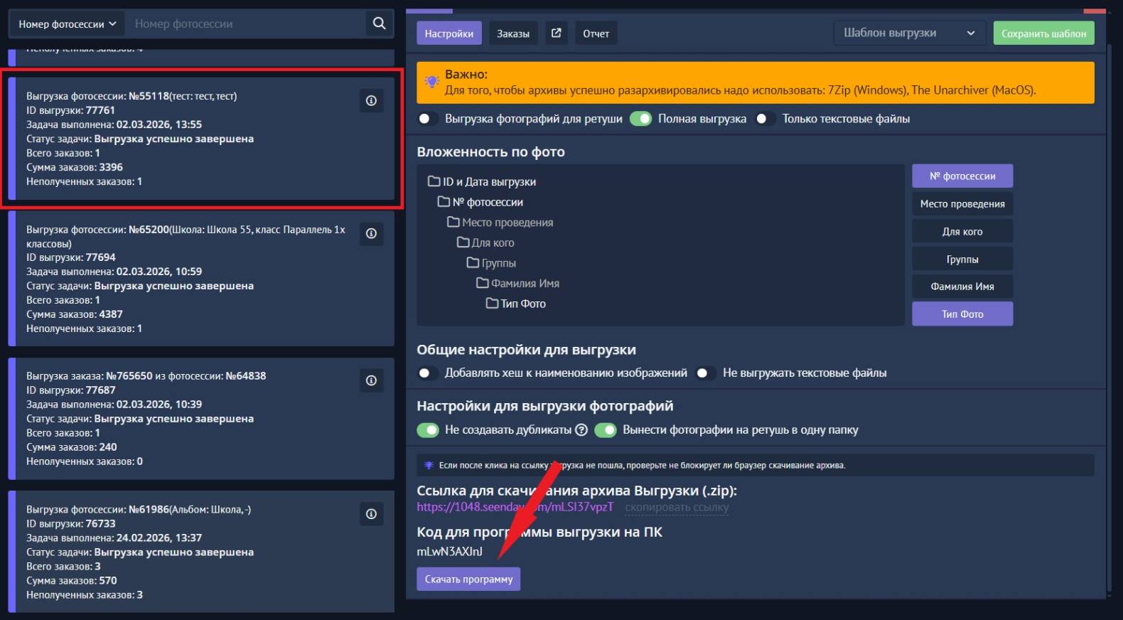Для начала проверьте настройки и вложенность выгрузки на сервисе, и также вставьте код для программы. После того, как фотографии отретушированы, чтобы разложить их по папкам также, как исходники на сервисе, в поле "исходные файлы" выберите папку с отретушированными фотографиями.