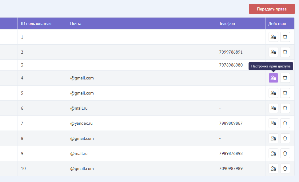 Настраивайте, к какой информации участник будет иметь доступ, и что он сможет редактировать. Чтобы зайти в раздел редактирования, нажмите эту кнопку действия в строке нужного пользователя.
