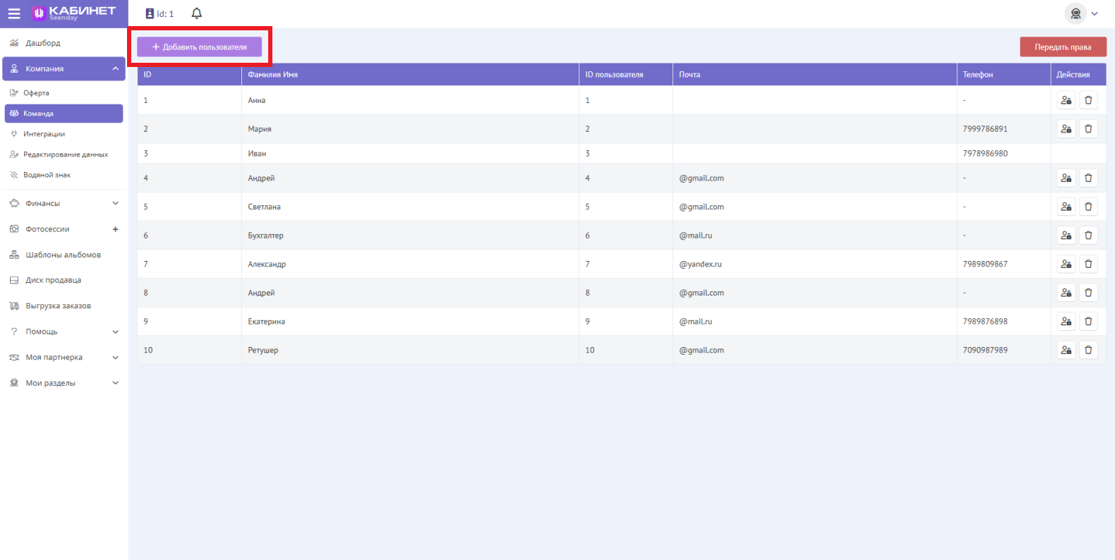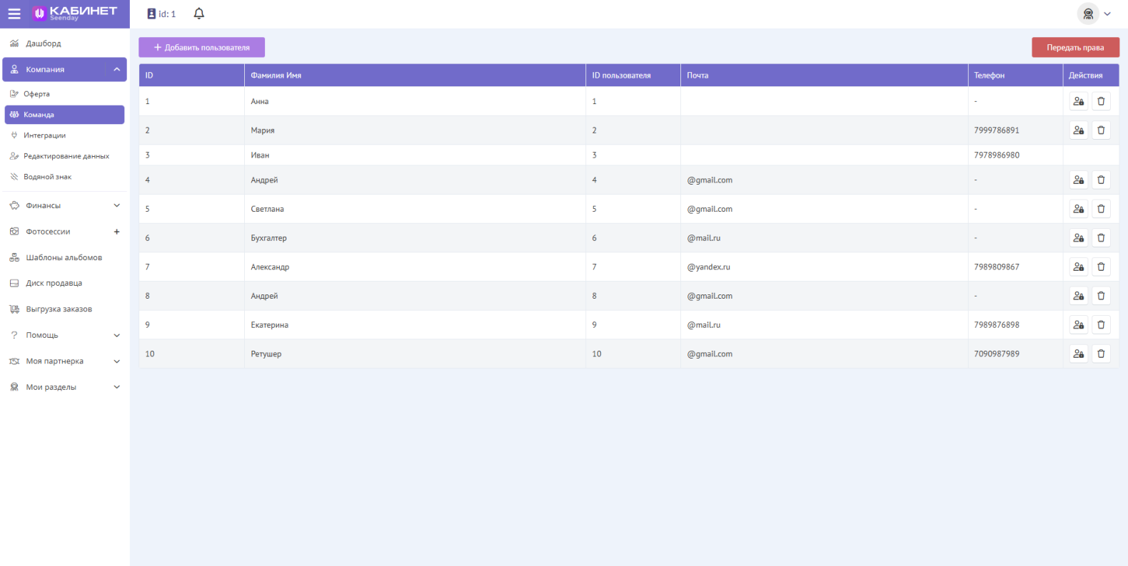 Чтобы перейти в данный раздел, в боковом меню выберите Компания -> Команда. Так выглядит страница: