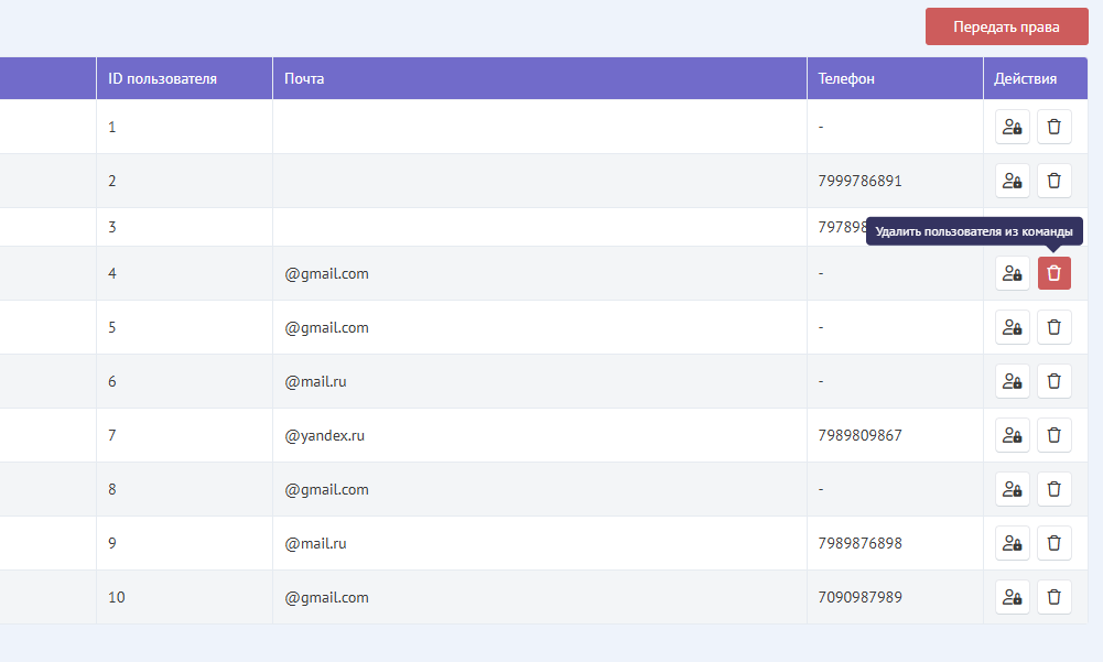 Можно удалить пользователя из команды, нажав на эту кнопку в строке нужного пользователя.