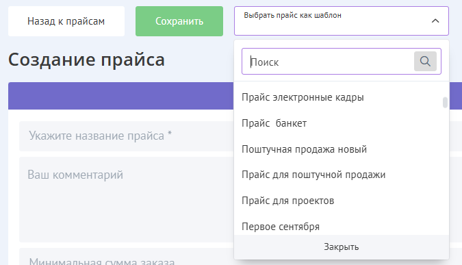 Если у Вас уже есть созданные прайсы, но вы хотите создать новый с минимальными отличиями, можно использовать существующий прайс как шаблон в этом окне: