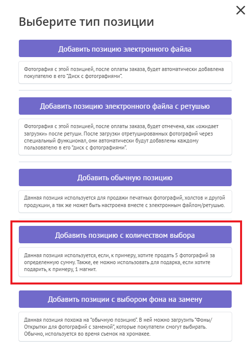 · Электронный файл/Электронный файл с ретушью – очень важно задавать эту позицию именно этими кнопками, чтобы электронные файлы подгружались в личный кабинет клиента. Электронный файл после оплаты практически сразу появится у покупателя в разделе «Диск с фотографиями», а электронный файл с ретушью – после того, как вы отретушируете фото и загрузите повторно на сервис;