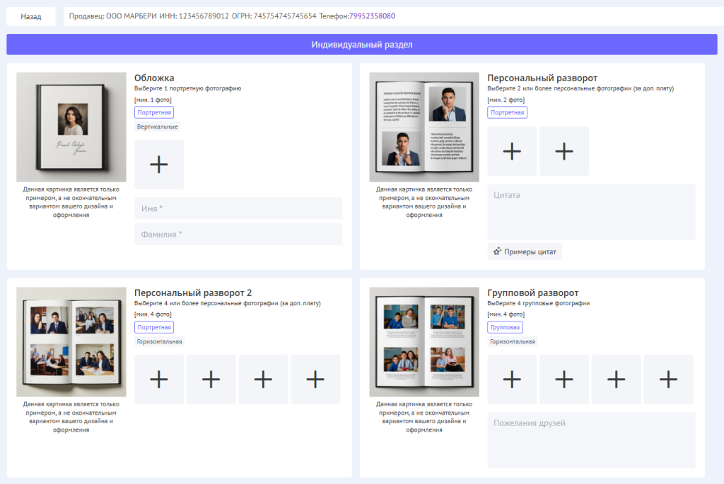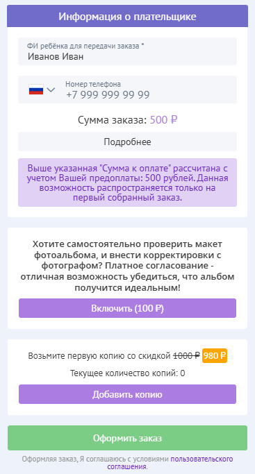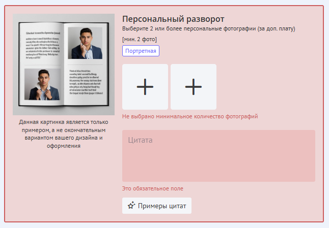 Если покупатель не выберет фотографии для какого-либо разворота или заполнит данные неверно, то сервис не пропустит его дальше к оформлению заказа и подсветит ошибочные поля красным: