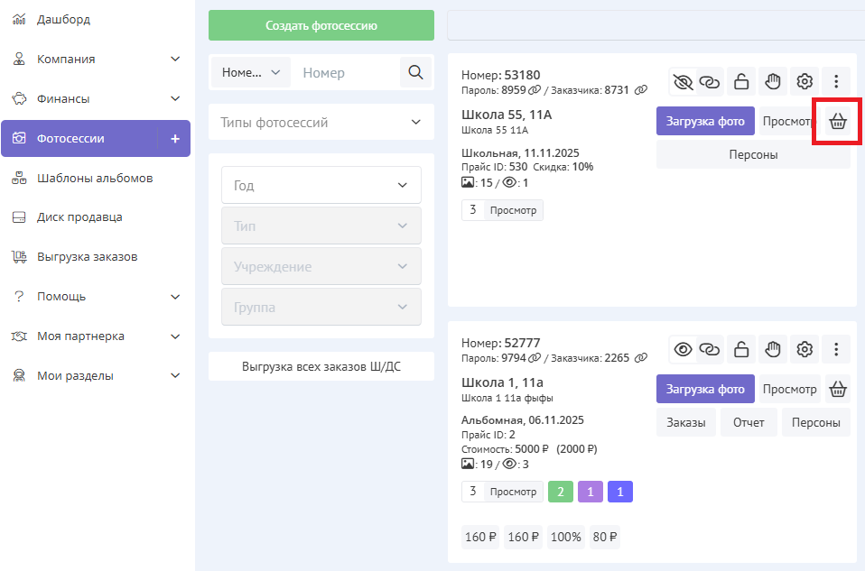 При просмотре обычной фотосессии будет доступна только покупка поштучной продукции или наборов, созданных ранее в прайсе.