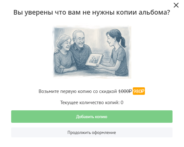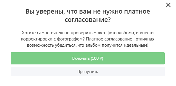 Если пользователь не выбрал услугу платного согласования или копию со скидкой, сервис предложит эти услуги повторно: