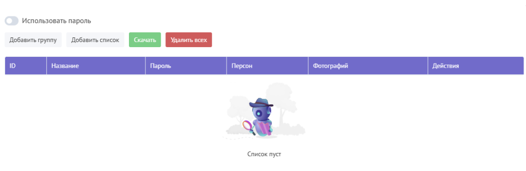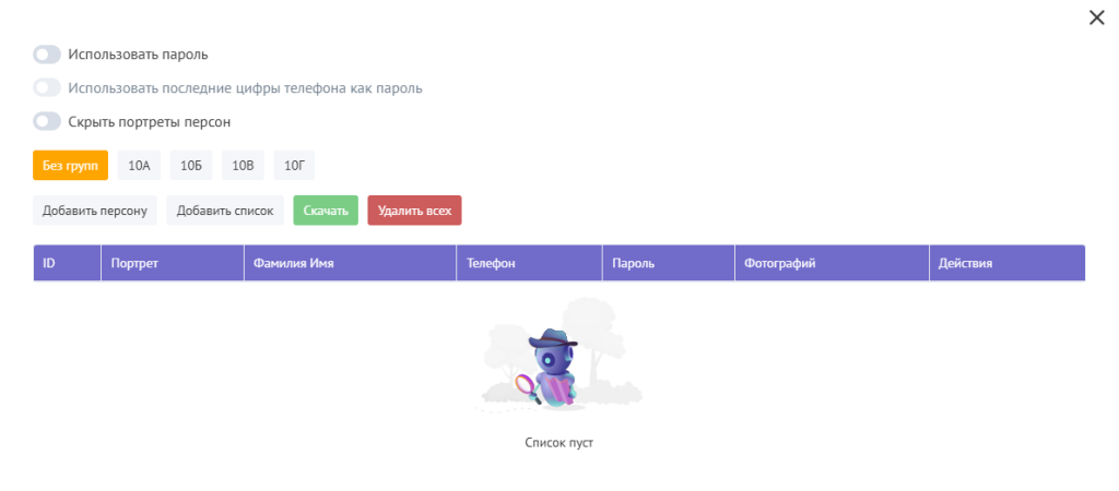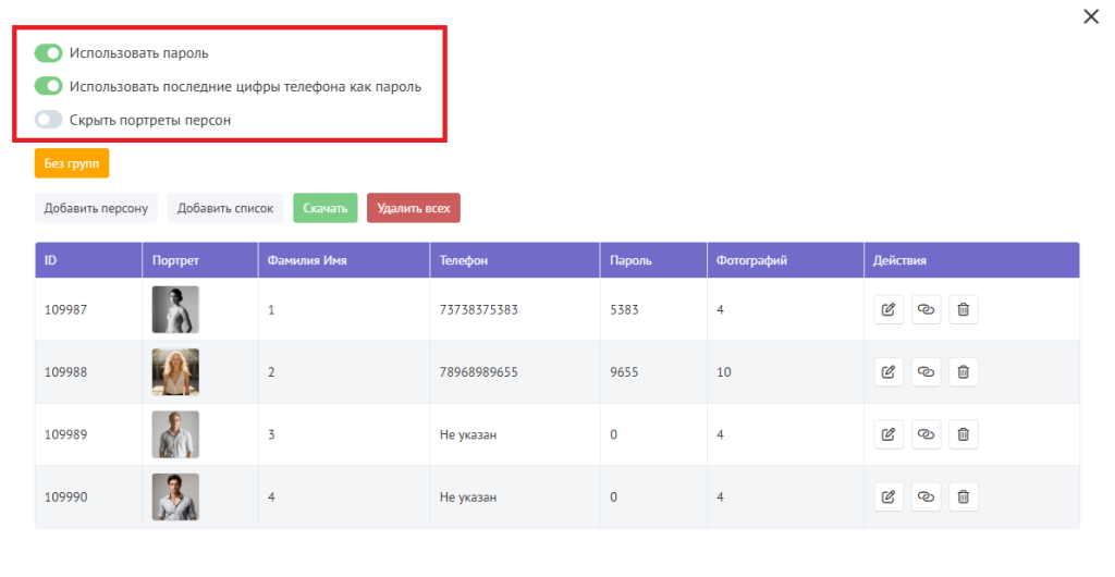 В этом окне Вы можете добавить персон по отдельности или списком, а в дальнейшем посмотреть уже созданных персон и задать к ним доступ по паролю: