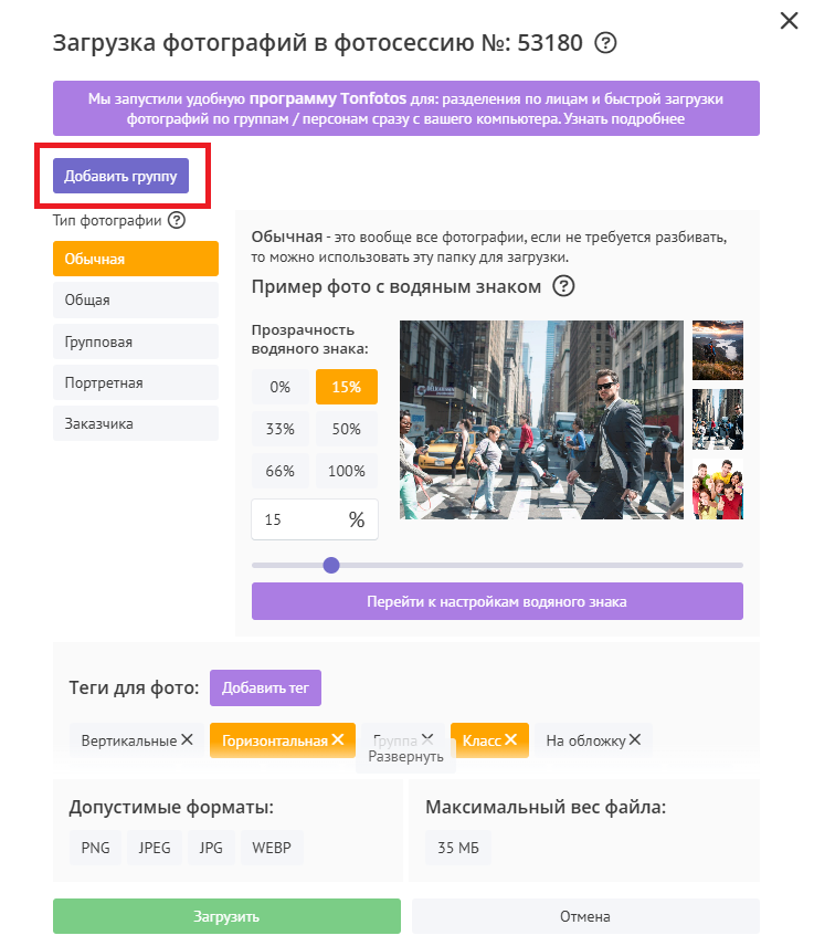 Теперь при загрузке фотографий появляется функция "Добавить группу". Выбираем по очереди каждую группу и тип фотографий и проставляем теги, если необходимо, и загружаем фотографии: