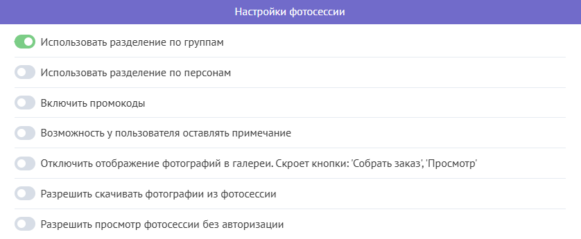Для того, чтобы этот функционал стал доступен, в настройках фотосессии активируйте "Разделение по группам":