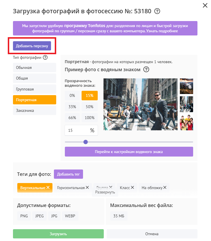 Теперь при загрузке фотографий появляется функция "Добавить персону". Выбираем по очереди каждую персону и тип фотографий и проставляем теги, если необходимо, и загружаем фотографии: