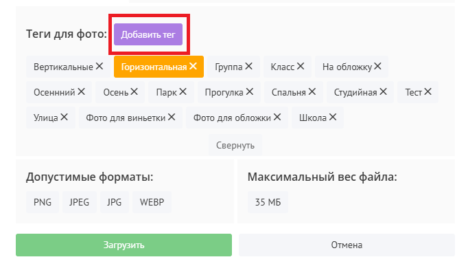 Помимо типов фотографий есть разделение по тегам. Вы можете добавить любые теги, связанные с размерами или тематикой фотографии, например: