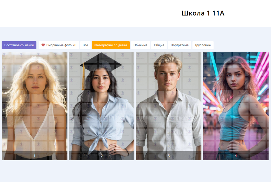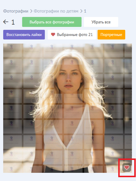 Далее покупатель выбирает понравившиеся фотографии, лайкая их. Отобранные фотографии можно посмотреть, нажав "Выбранные фото" вверху страницы.