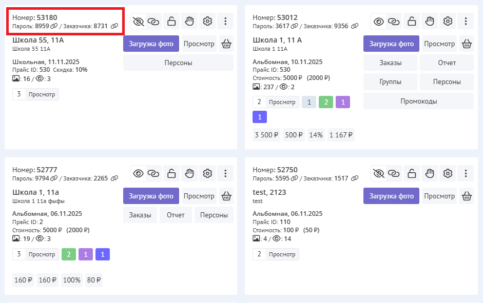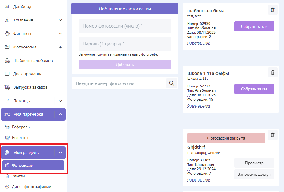 Для просмотра фотосессии от лица заказчика, добавьте ее по номеру фотосессии и паролю в этом разделе: