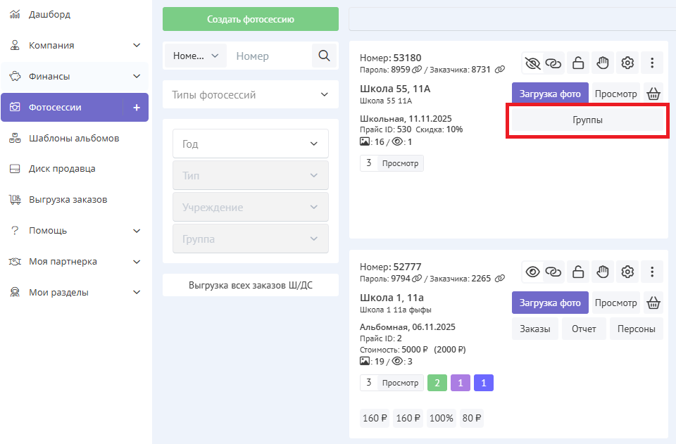 Тогда в фотосессии появится дополнительный раздел "Группы":
