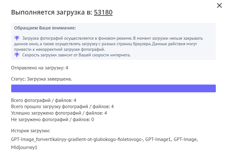 · Загрузка фотографий осуществляется в фоновом режиме. В момент загрузки нельзя закрывать данное окно, а также осуществлять загрузку с разных страниц браузера. Данные действия могут привести к некорректной загрузке фотографий.