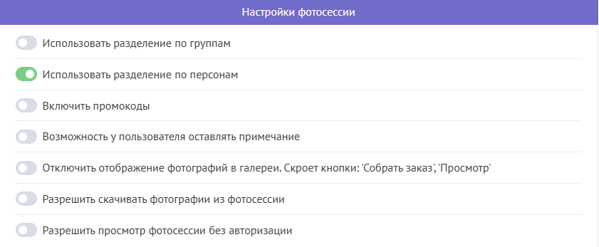 Чтобы этот функционал стал доступен, в настройках фотосессии активируйте "Разделение по персонам":