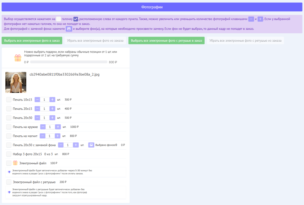 Ниже есть возможность докупить отобранные фотографии отдельно после оформления альбома, если в настройках фотосессии активирован ползунок "Включить возможность заказа фотографий поштучно и наборов вместе с оформлением альбома":