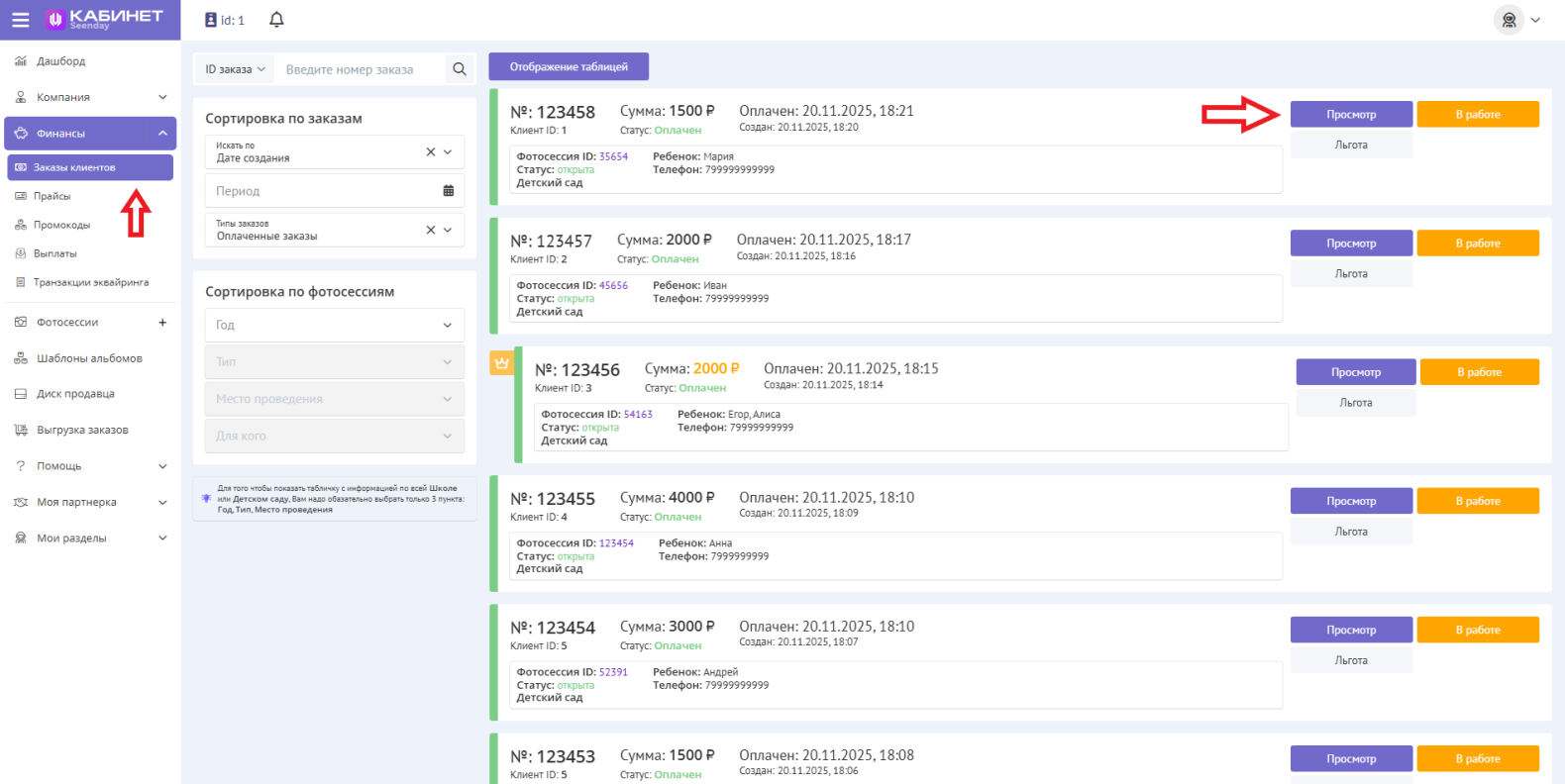 Проверить заказы детально можно в Финансы -> Заказы клиентов -> Просмотр: