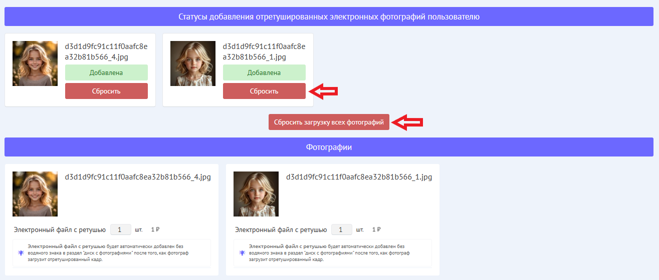 После сброса загрузки кнопка "Загрузка отретушированных" в фотосессии снова станет активна.