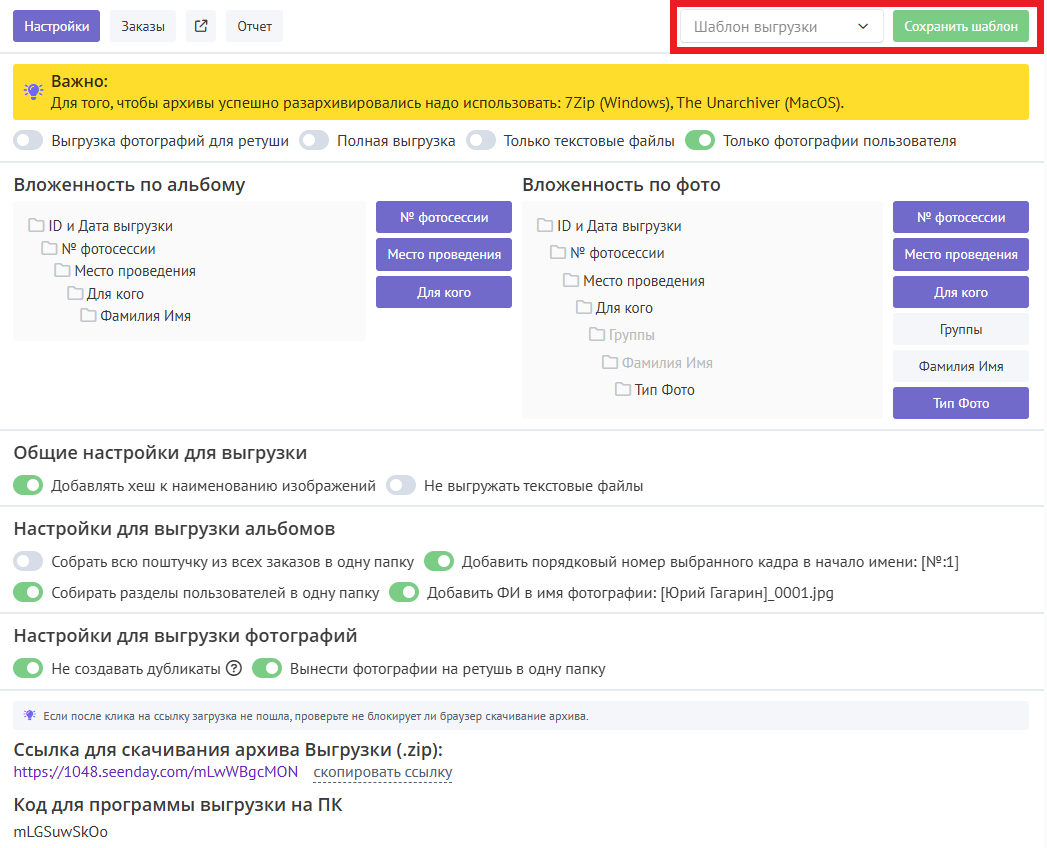 Сохранение шаблонов выгрузок