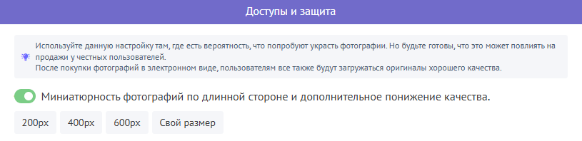 Помимо водяного знака, теперь можно включать настройку "миниатюрность" , чтобы фотографии точно были в безопасности до момента оплаты заказа. А еще можно выбрать, какого размера будет миниатюрная версия фотографии.