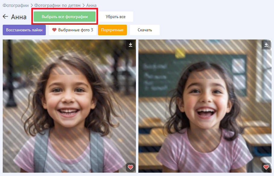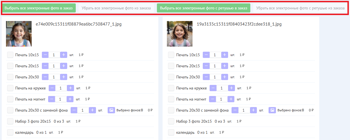 Ко всем выбранным фотографиям при оформлении сервис будет предлагать выкупить их полностью в электронном формате и электронном формате с ретушью - это можно сделать в один клик.