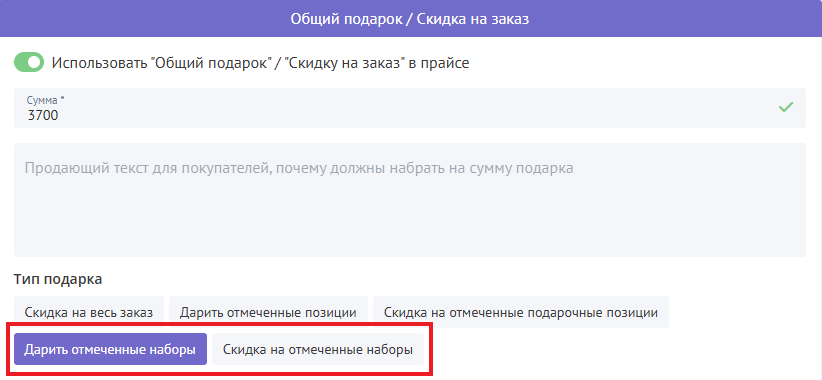 Добавили возможность дарить наборы или делать скидку на наборы от определенной суммы заказа.