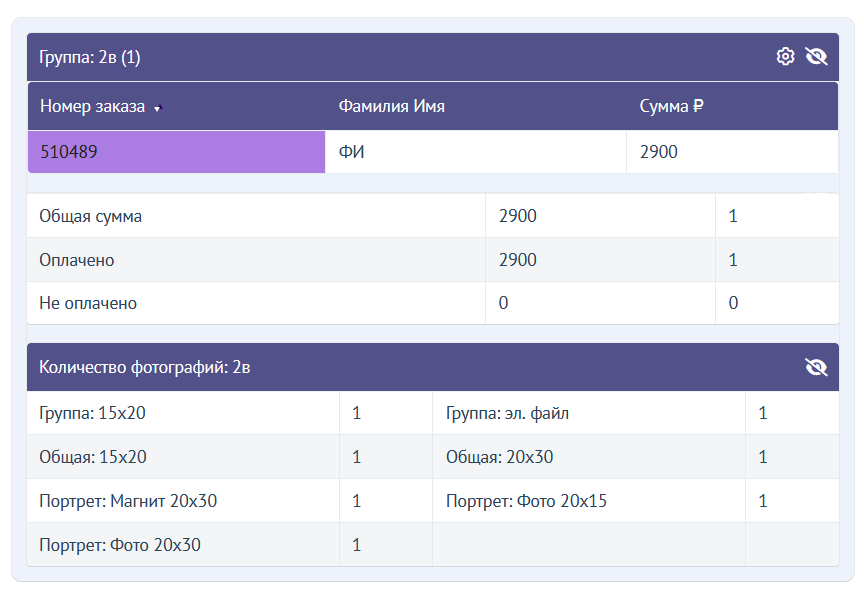 Чтобы увеличить конверсию покупок фотографий и альбомов и выявлять тех, кто не заказал - теперь можно просматривать список заказов, состоящий из информации о заказе, фимилии и имени ребенка и группы. Чтобы его подключить нужно нажать кнопку "Только список" как показано на скриншоте.