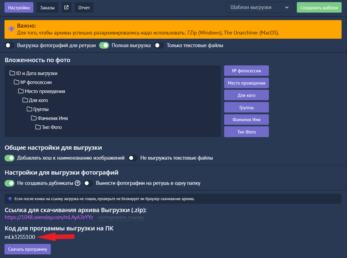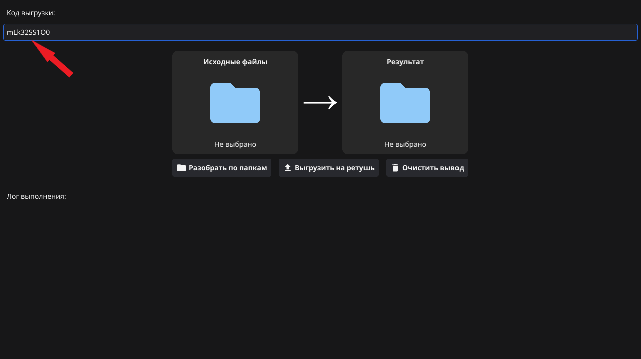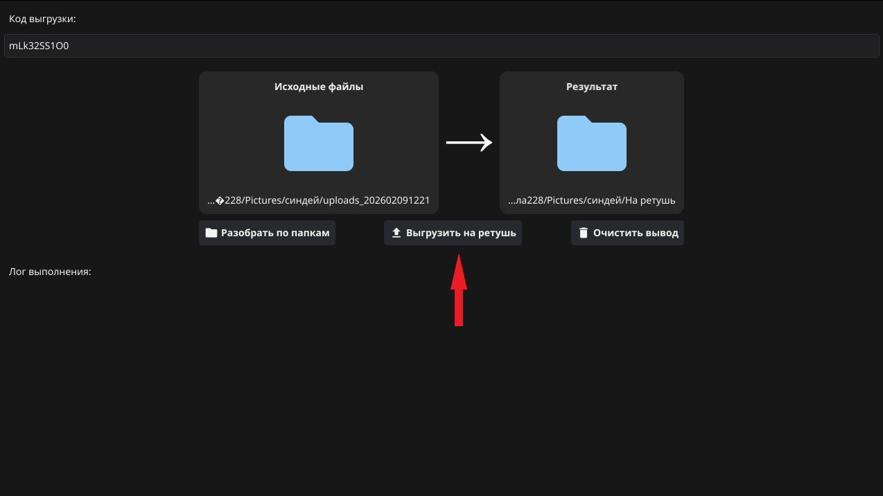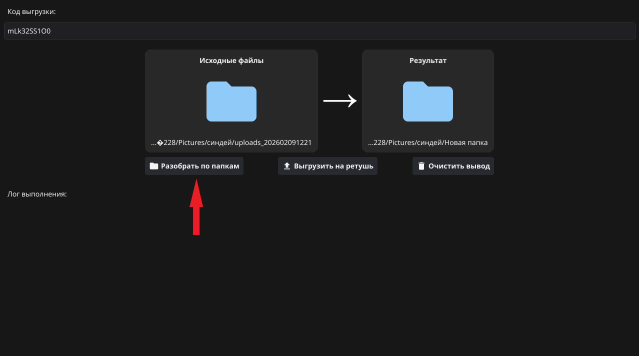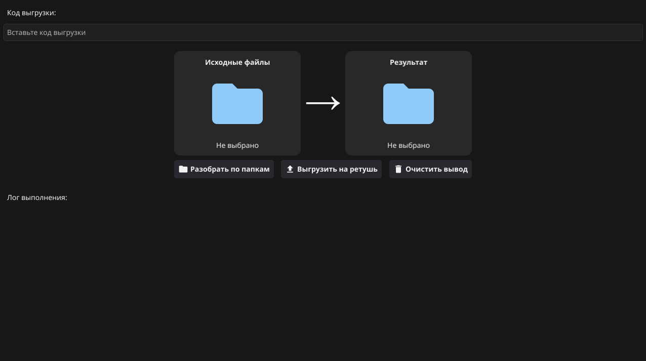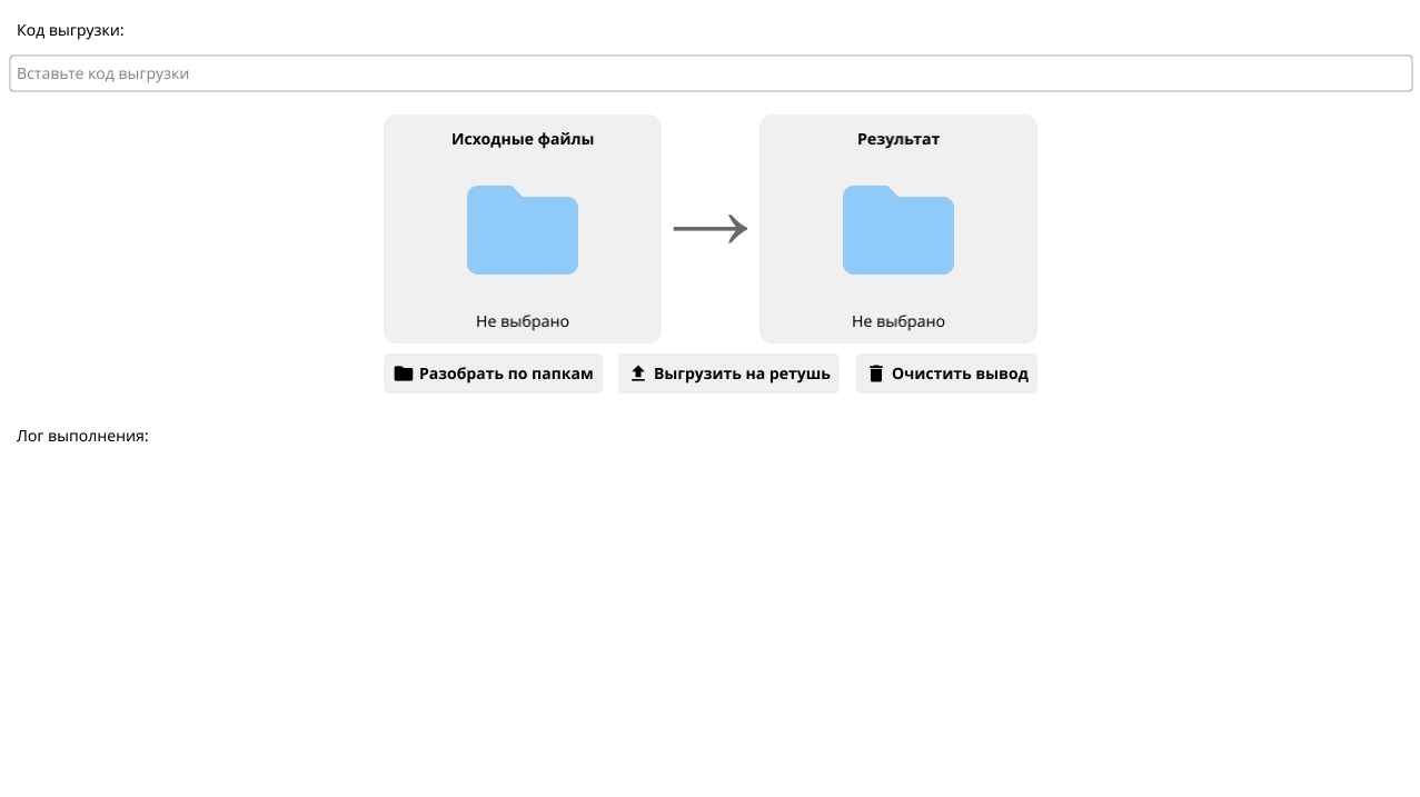 Для начала проверьте настройки и вложенность выгрузки на сервисе, и также вставьте код для программы. После того, как фотографии отретушированы, чтобы разложить их по папкам также, как исходники на сервисе, в поле "исходные файлы" выберите папку с отретушированными фотографиями: