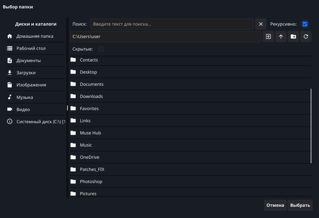 - Рекурсивный поиск сканирует выбранную папку и все её подпапки. Полезно, если вы не помните точное расположение файла, но знаете его название или часть имени. Для включения такого поиска проставьте галочку "Рекурсивно" рядом с поисковой строкой.