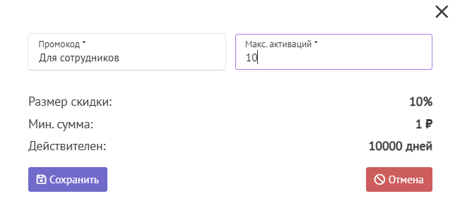 Задайте название промокода, которое будет видно покупателям и заказчикам, введите максимальное количество применений, и сохраните: