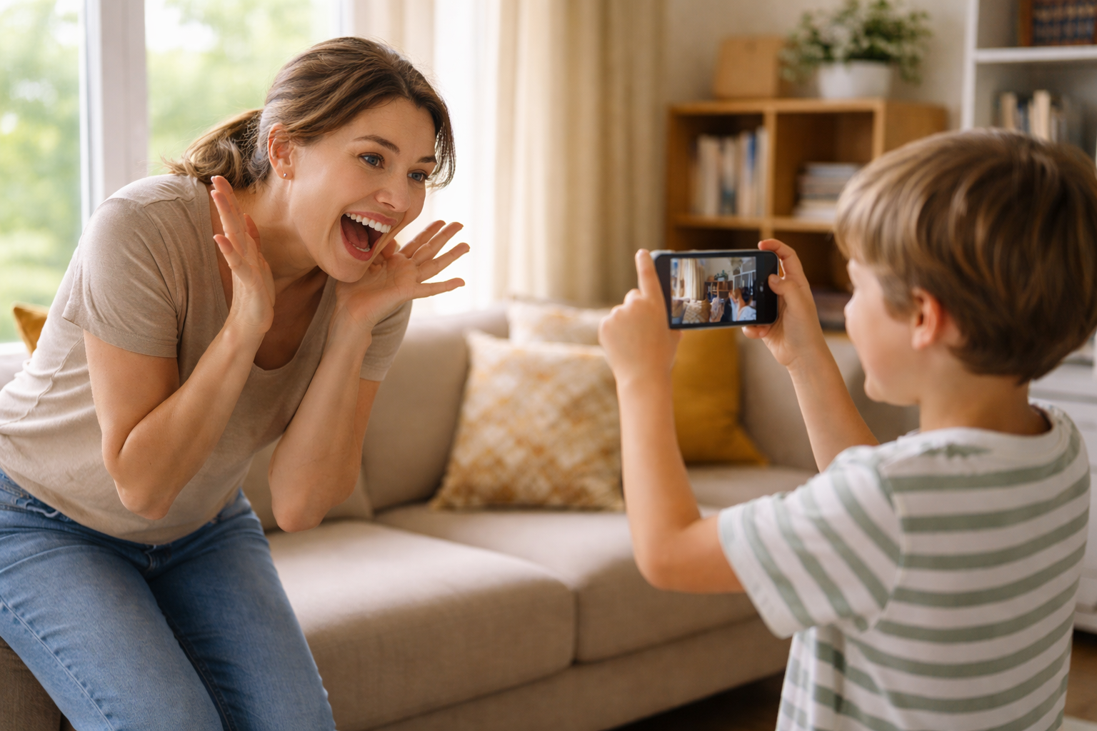 - Дома: Устройте «тренировочную» съемку на телефон в игровой форме. Пусть ребенок побудет фотографом, а вы — моделью.