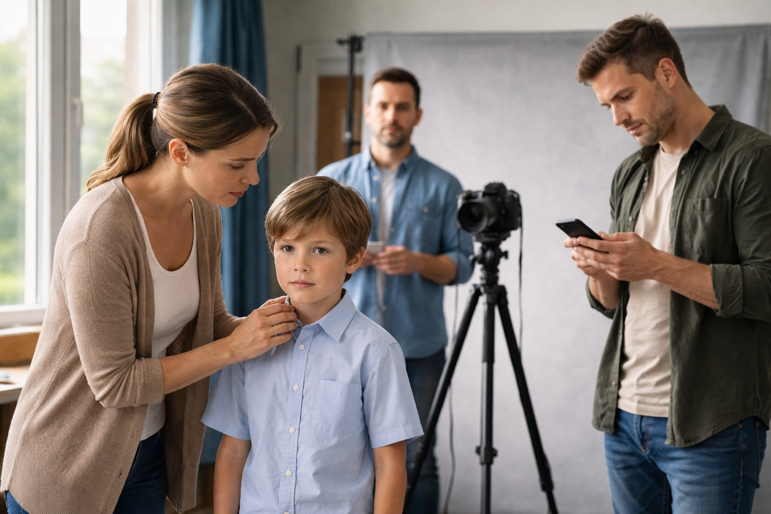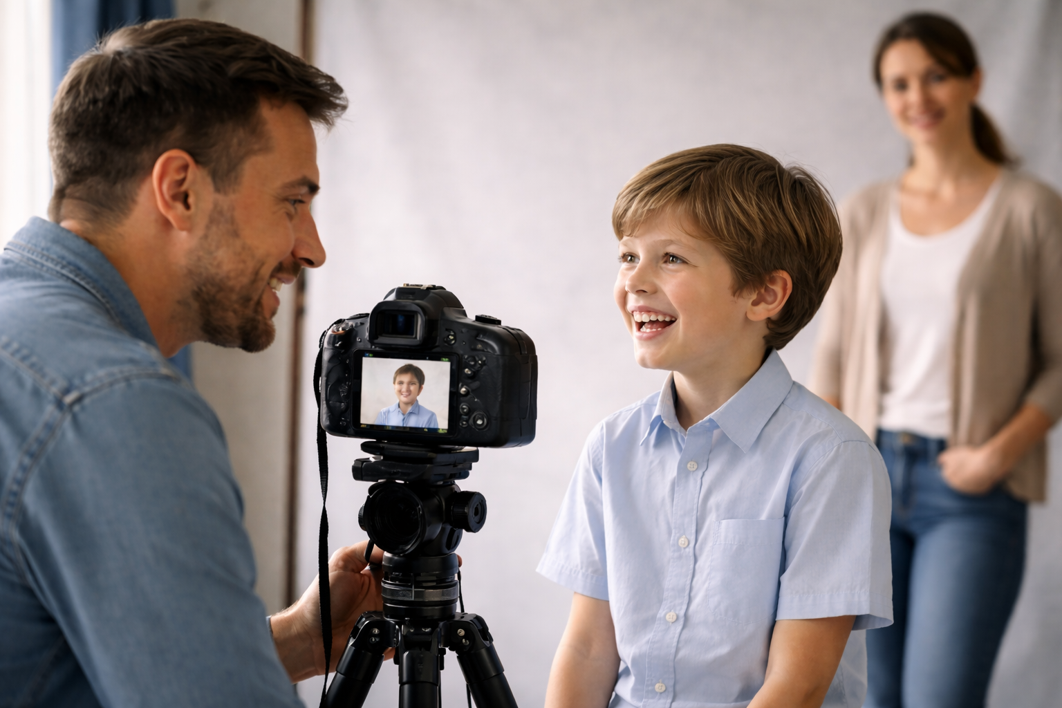 - Как помочь родителю: Не заставляйте его «быть смелым» — это усилит зажим. Дайте ребенку в карман маленькую любимую игрушку «для храбрости». Иногда помогает просто постоять рядом первые пару минут, не вмешиваясь в процесс, чтобы ребенок привык к чужому человеку с камерой.